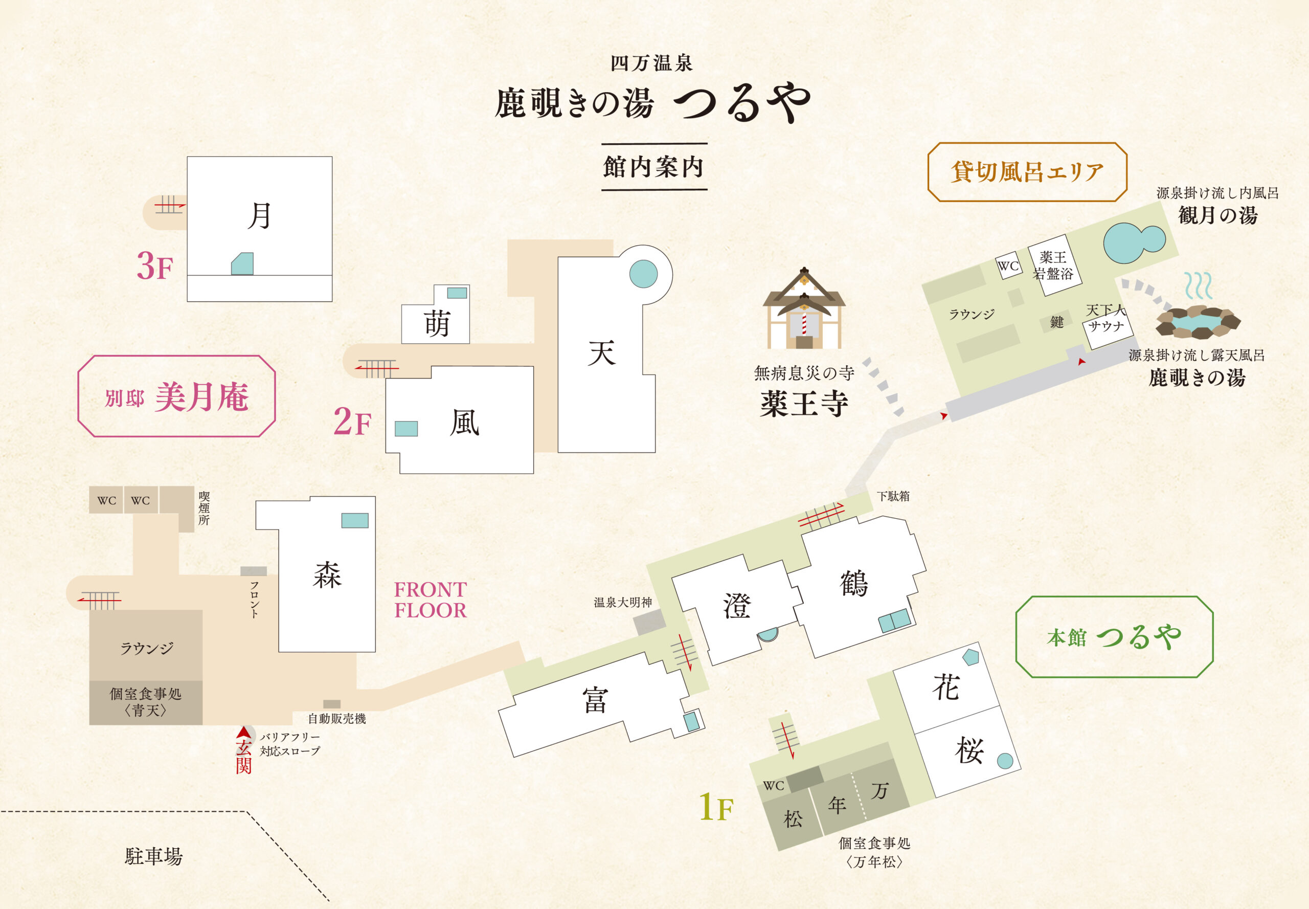 館内施設 : 貸切露天風呂「鹿覗きの湯」、貸切内湯「観月の湯」、薬王岩盤浴、天下人サウナ