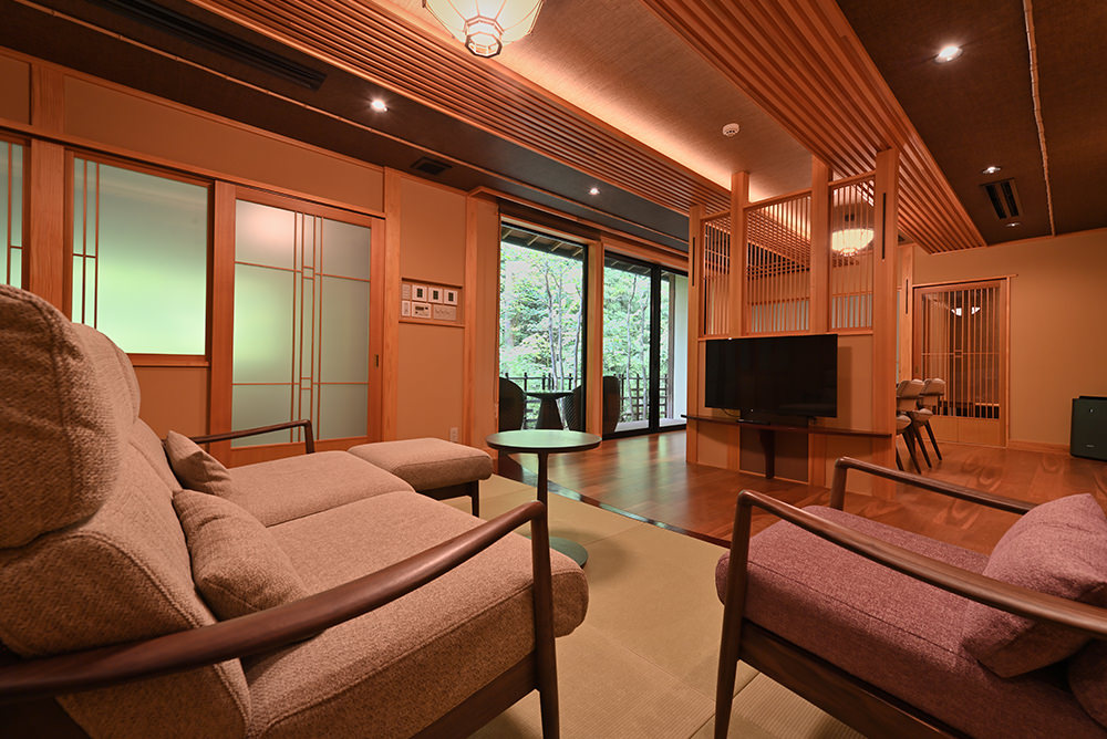 広めの間取と和の意匠を施したゆったりと寛げる空間 ⚪︎ご家族、友人同士の大人数でも対応できる(最大6名様)