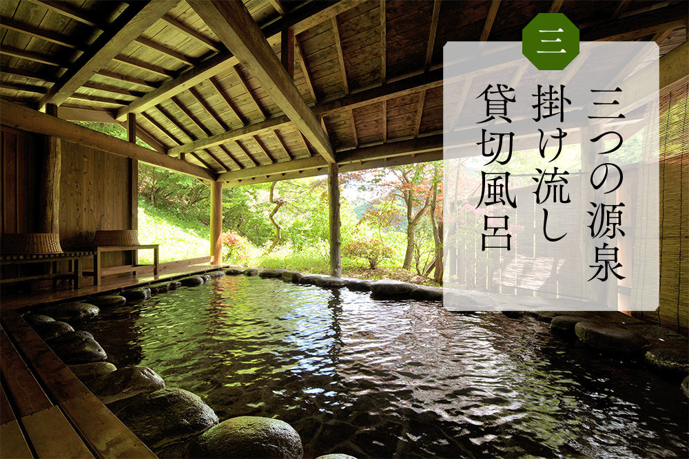 館内施設 : 貸切露天風呂「鹿覗きの湯」、貸切内湯「観月の湯」、薬王岩盤浴、天下人サウナ