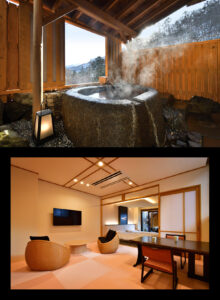 館内施設 : 貸切露天風呂「鹿覗きの湯」、貸切内湯「観月の湯」、薬王岩盤浴、天下人サウナ